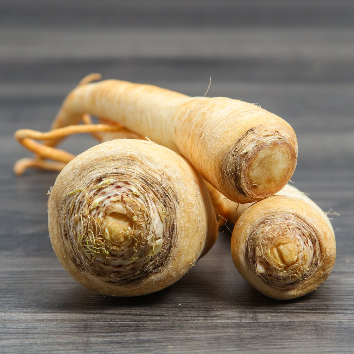 Die Petersilienwurzel ist eine weißliche Wurzel, die geschmacklich an eine Mischung aus Petersilie und Pastinake erinnert. Sie wird häufig in Suppen, Eintöpfen und als Gemüsebeilage verwendet.