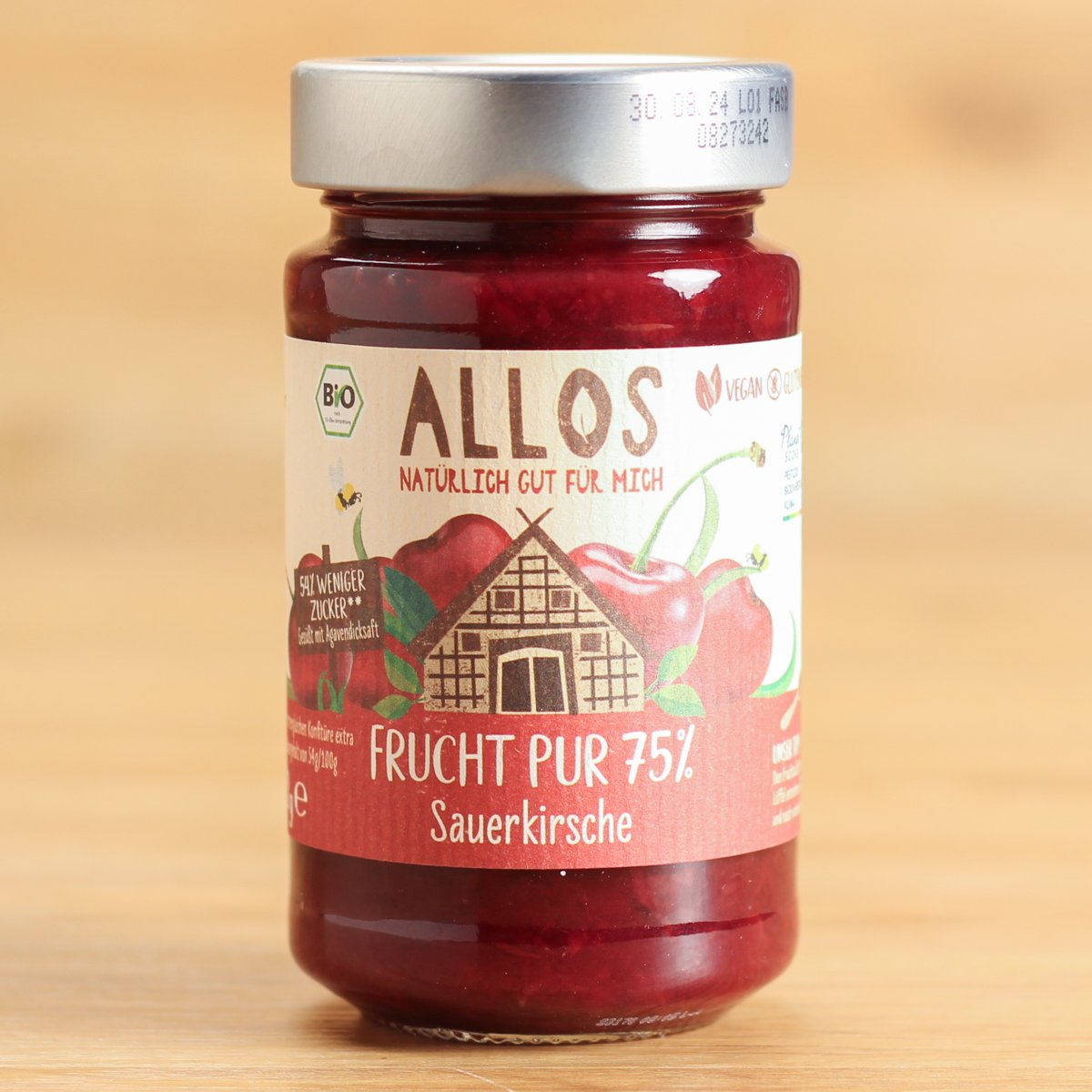 Sauerkirschen* (75%), Agavendicksaft* (20%), Geliermittel: Pektine, Festigungsmittel: Calciumcitrate, Zitronensaftkonzentrat*.
