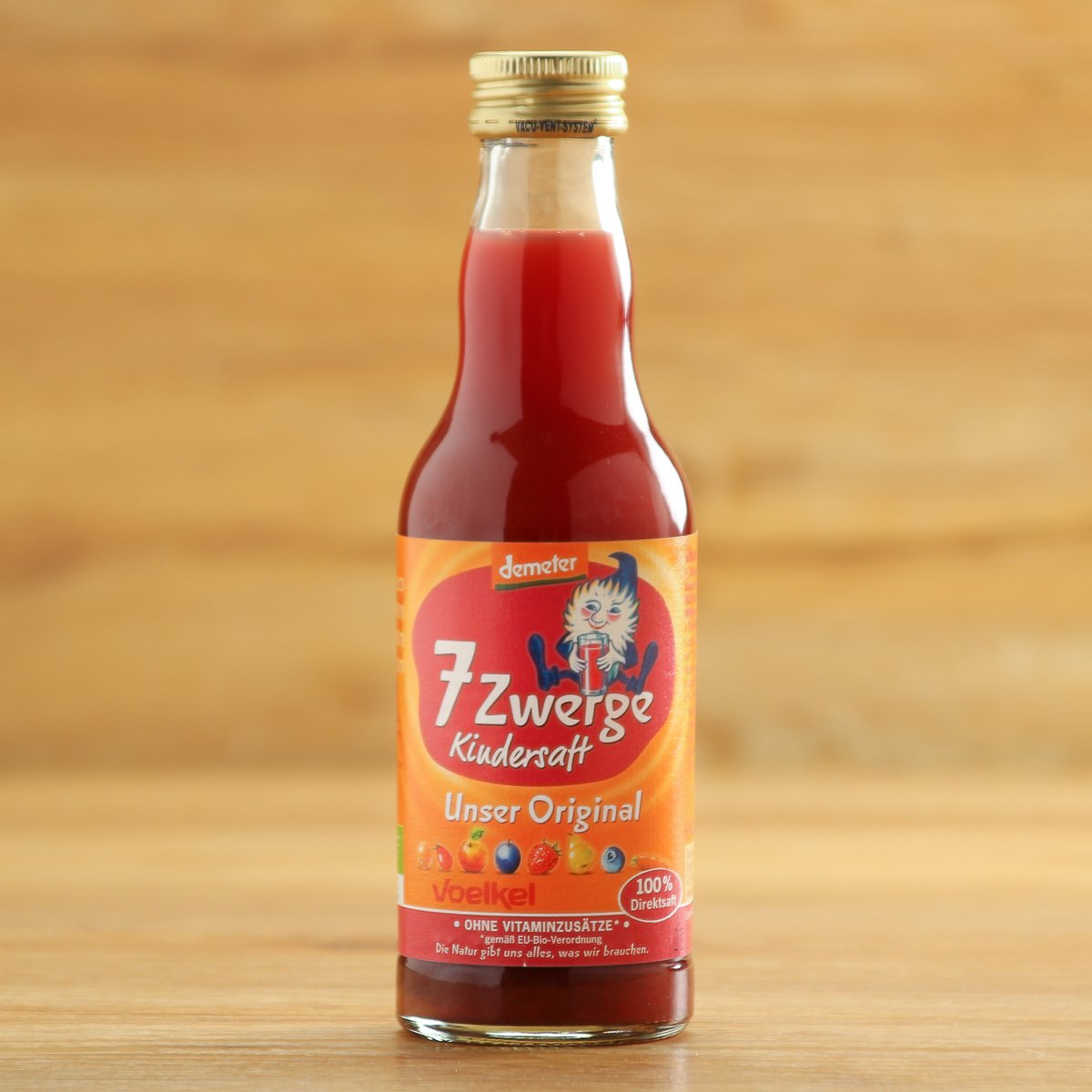 Bei der sorgsamen Entwicklung der Originalrezeptur unseres 7 Zwerge Kindersaftes haben wir von Voelkel bereits vor über 20 Jahren Wert darauf gelegt, verschiedene Fruchtformen aus allen Regionen der einheimischen Pflanzenwelt - Baum, Busch, Strauch und Wurzeln - zu einer wohlschmeckenden Komposition zu vereinen. Im Sinne einer ganzheitlichen Denkweise symbolisieren die Reifedauer, der Erntezeitpunkt und die unterschiedlichen Wachstumsformen der sorgsam ausgewählten Früchte und der Möhre die natürliche Artenvielfalt unserer Natur. Die aromatische Möhre, gewachsen in der Erde, die blauen Heidelbeeren und wohlschmeckenden Erdbeeren, die Sanddornbeeren und Hagebuttenfrüchte vom Strauch, die sonnenverwöhnten Weinreben bis hin zu den fruchtigen Äpfeln und Birnen vom Baum werden schonend und werterhaltend zu 100% Direktsäften gepresst und zu dieser naturköstlichen Rezeptur vereint. Mit 89 % Frucht- und 11 % Möhrensaft ist ´Unser Original´, im Sinne einer ganzheitlichen Ernährung, speziell auf
