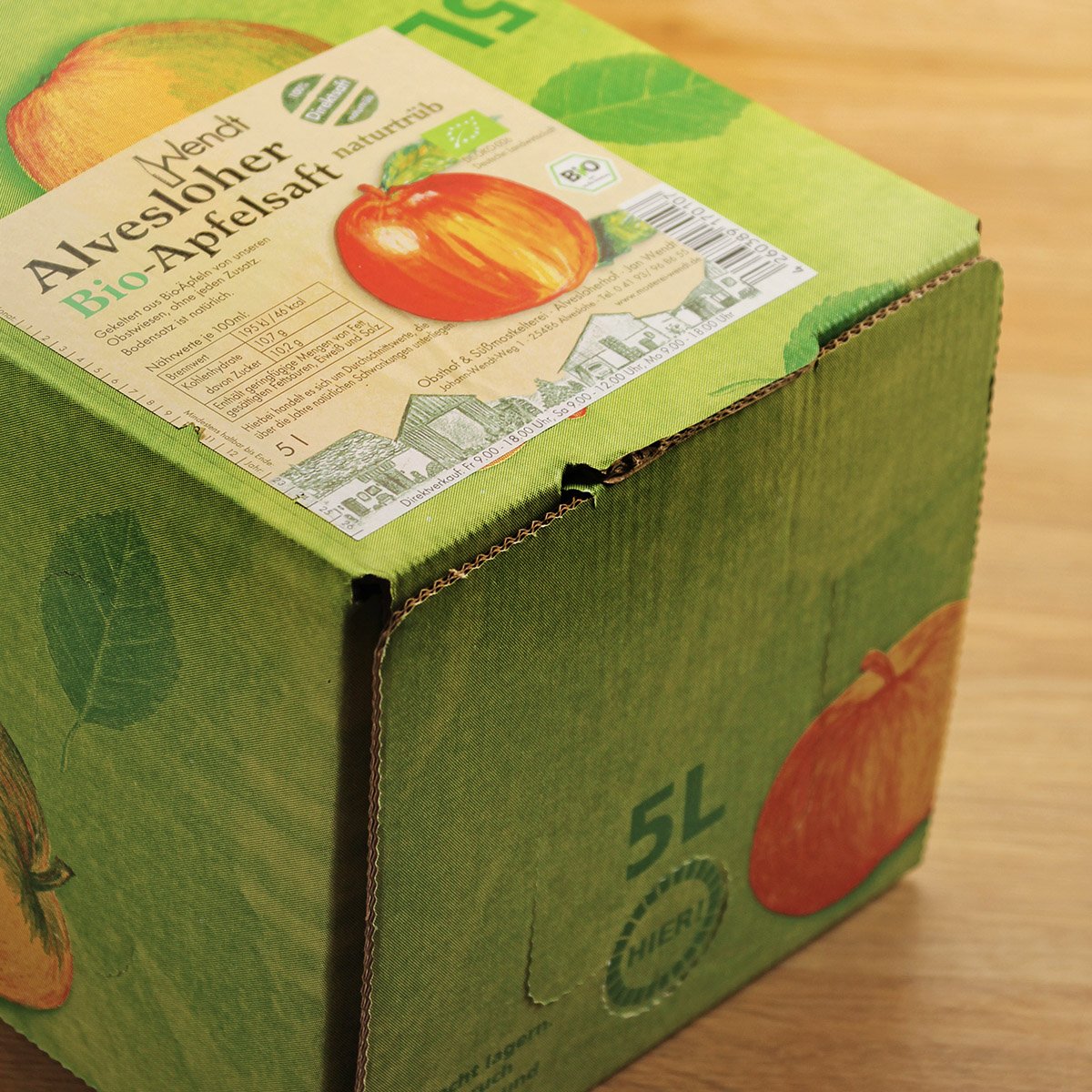Der fein aromatische Alvesloer Apfelsaft in der praktischen 5 l Bag in Box. Durch den Zapfhahn bleibt bei der Entnahme immer ein Vakuum, sodass der Saft auch angebrochen lange frisch bleibt.