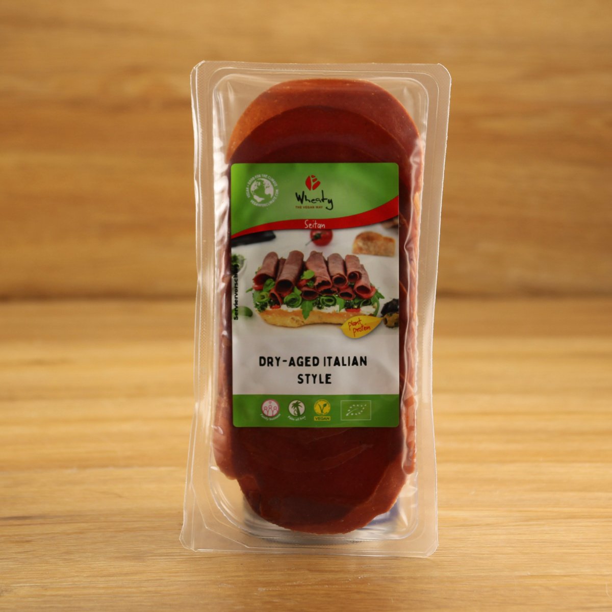 Luftgetrocknet, mild im Geschmack und unglaublich zart in der Konsistenz. Fast unglaublich, dass es sich hierbei um einen veganen Aufschnitt handelt, der ohne Chemie und künstliche Aromen auskommt. Traditionell nach den hohen Wheaty Standards im Rahmen der Biorichtlinien im deutschen Familienbetrieb der TOPAS GmbH hergestellt. Genießen Sie unsere ´Dry-Aged Italian Style´ klassisch am Besten mit einer dezenten Pesto Unterlage auf einem frischen Ciabatta, oder als Vorspeise mit veganen Parmesansplittern, Olivenöl, Zitronensaft und frischem Rucola. Guten Appetit!