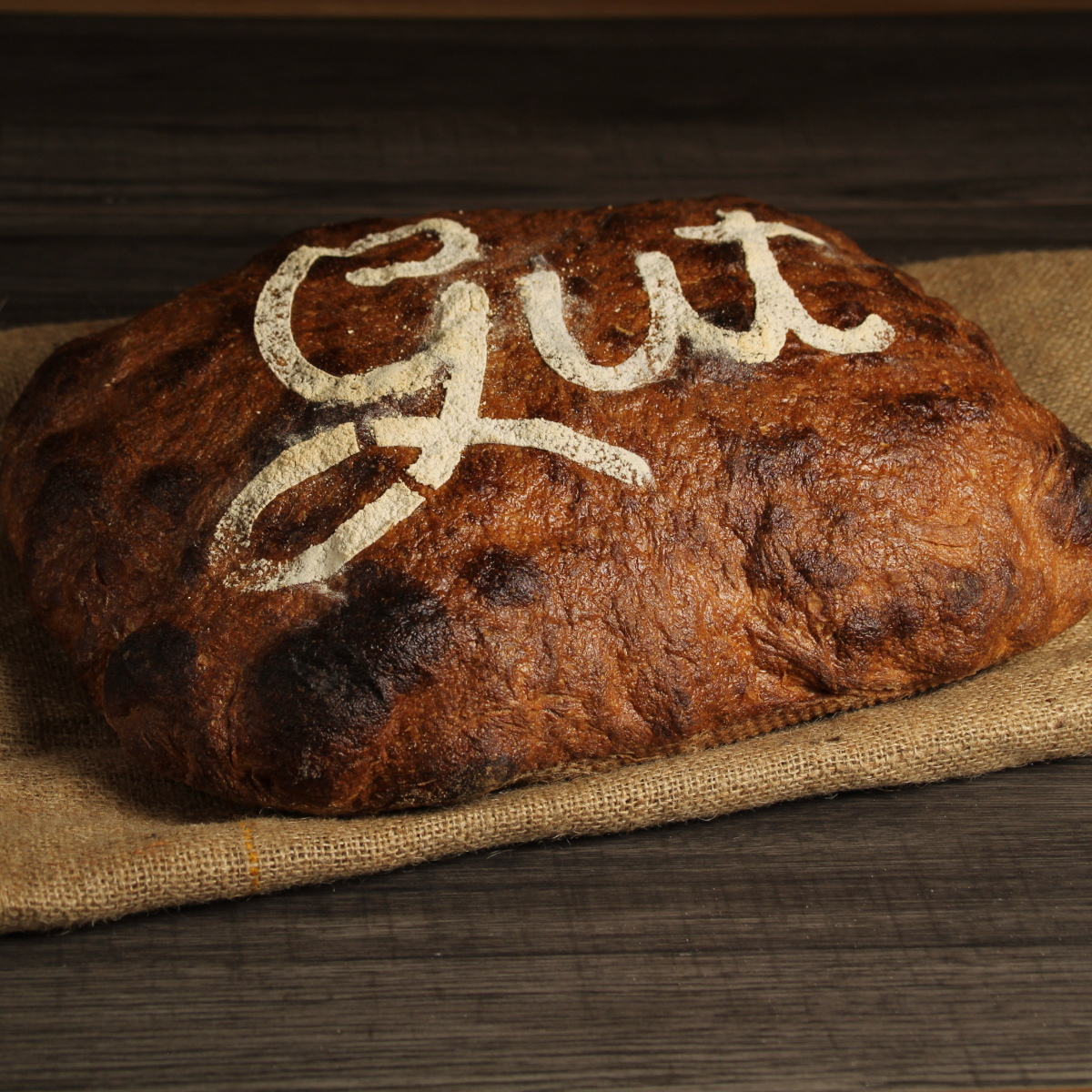 Unser Wulksfelder Gutslaib ist ein helles Brot mit dunkler Kruste und grober Porung. Das Besondere an diesem Brot ist der selbst gezüchtete Weizensauerteig aus Wulksfelder