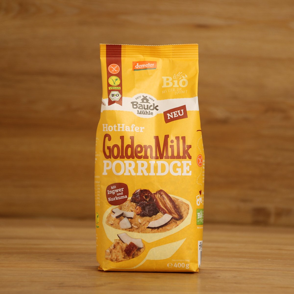 Vegane Zubereitung für 1 Portionen: 1. 50 g (5 EL) Porridge in eine Schale geben 2. Mit 125 ml kochendem Planzendrink verrühren und 2 Minuten quellen lassen. 3. Warm genießen und nach Geschmack mit Früchten, Fruchtmus oder Nüssen toppen