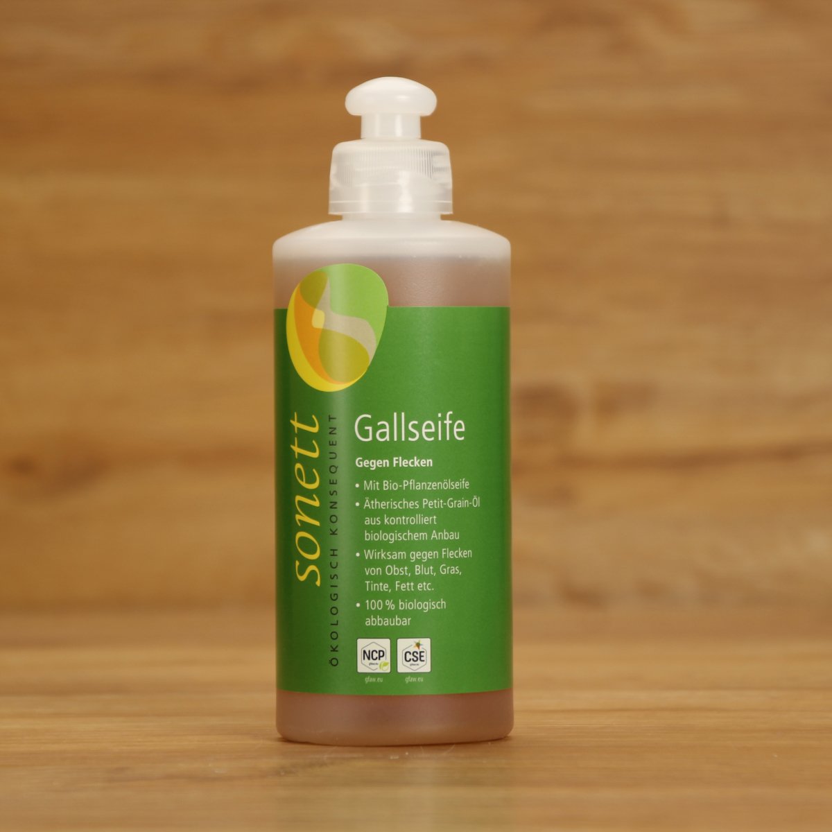 Die flüssige Gallseife unverdünnt auf den Fleck auftragen und 10–15 Minuten einwirken lassen. Gründlich auswaschen oder das Kleidungsstück direkt in die Waschmaschine geben.