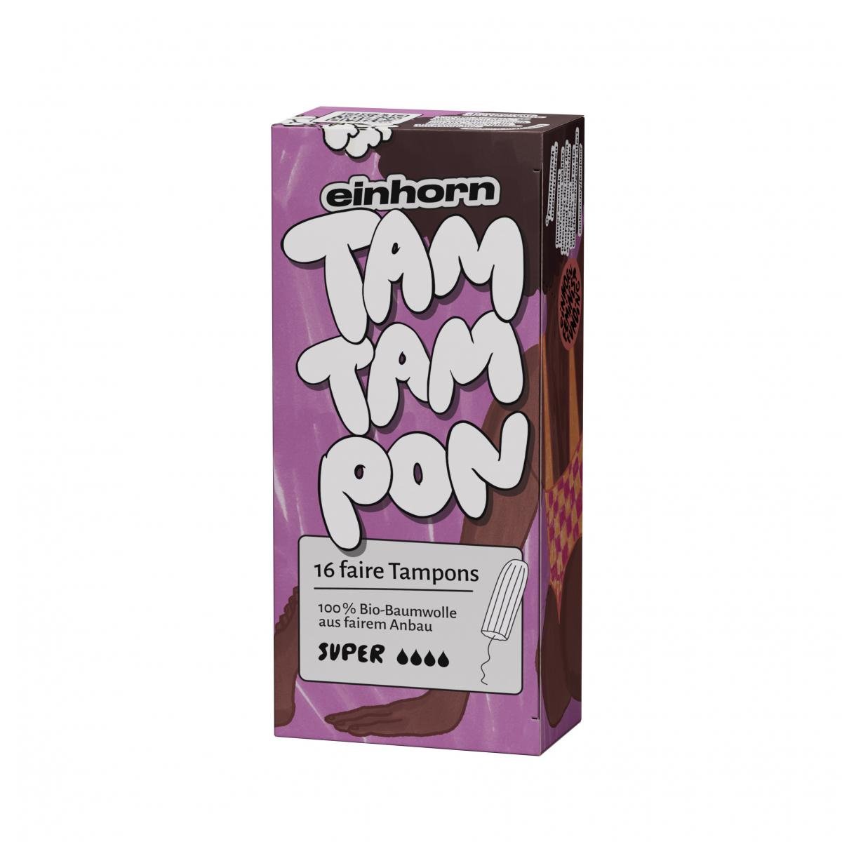 einhorn TamTampons super bestehen aus 100% zertifizierter Bio-Baumwolle. Sie bieten Komfort, sind hypoallergen und saugfähig. Noch dazu machen sie richtig was her im Badezimmer! Mit ihren empowernden Botschaften machen sie jede Periode zum Highlight! Die Größe normalo eignet sich am besten für eine mittlere bis starke Periode. 50% der Profite gehen z.B. an Menschenrechtsprojekte in Tansania.